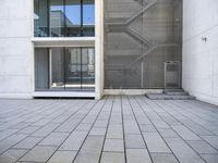 A view of a residential area in the business district of Lisbon, Portugal. The modern architecture is characterized by a composite material facade, a high-rise office building, wood doors, and a paved open space with a grey asphalt road surface and vegetation.