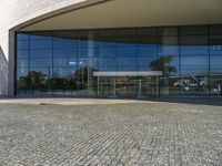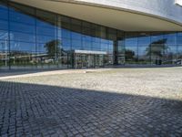 A view of a modern office building and urban design in Lisbon, Portugal, featuring a composite material facade, open space, road, tar, flooring, glass, trees, and a clear sky.