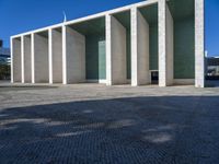 A cobblestone plaza is surrounded by a modern office building, with a rectangular fixture casting a hard shadow on the asphalt road surface beneath the clear blue sky. Urban design and city life come together in Lisbon, Portugal.