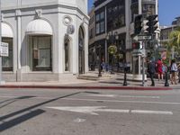 A view of the modern architecture in Los Angeles, California, USA. The city's vibrant urban design is showcased through the sleek buildings, tree-lined streets, and clear blue sky.