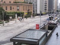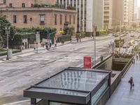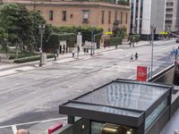 A view of a high-rise office building surrounded by trees and urban infrastructure in the bustling city of Los Angeles, California, USA.