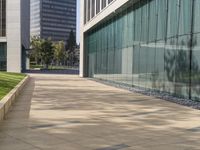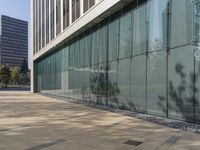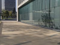 the shadow of a man walks across the sidewalk as he crosses an empty street in front of glass and concrete buildings
