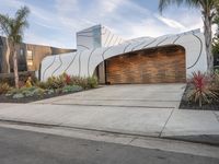 A stunning residential building in Los Angeles, California, USA. The modern architecture and sleek design make it a standout in the city. This property is located in a suburban area, with a beautiful driveway and lush tree-lined surroundings. The low concrete structure and futuristic architecture add a touch of urban design to the residential area. The photo was taken at dawn, with clouds and contrails in the sky, creating a mesmerizing backdrop. The house is a perfect blend of urban life and peaceful living, making it an ideal home for anyone looking for a contemporary and stylish property in Los Angeles.