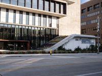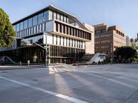 In Los Angeles, California, modern architecture defines the urban landscape, with office buildings rising against a backdrop of clear skies. The city's profile is shaped by its iconic roadways and asphalt surfaces, reflecting the vibrant day-to-day life of this bustling metropolis in the USA.