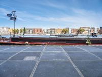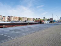 A cityscape in the Netherlands depicting modern architecture, public spaces, and transportation. The skyline is filled with solar panels, brickwork, and other building materials, providing a unique view of the European city.