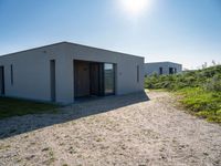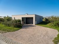 A modern residential villa nestled in a rural landscape in the Netherlands, with a clear sky and plenty of vegetation. The building facade features a variety of architectural fixtures, including windows, doors, and a sloped land lot with a grass, asphalt, and tree surface.