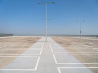 A concrete street in Holland, Netherlands, with a clear sky, asphalt road surface, parking lot, public utilities, modern architecture, and a variety of other infrastructure components. The landscape displays a symmetrical horizon with grass, trees, and wooden fencing.