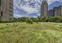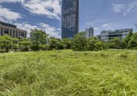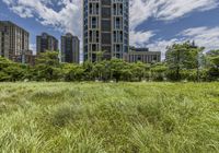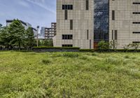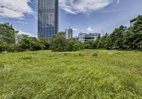 A striking high-rise building with lush green vegetation and a tree in the foreground stands tall against the horizon in Taipei City, Republic of China. The modern architecture of the skyscraper combined with the natural environment of the cityscape creates a unique urban design for the business district.