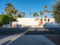 A stunning example of modern residential architecture in Palm Springs, California, USA. The clear sky at dawn illuminates the sleek design of this beautiful home, set against the backdrop of the Sonora Desert. The palm trees and stone walls add to the suburban charm of this property.