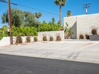 View of a residential villa located in Palm Springs, California, USA. The low mid century modern architecture is highlighted by the asphalt driveway, concrete parking lot, and entry wall. Palm trees dot the clear sky of the Sonora Desert as the view looks straight down the road.
