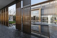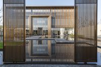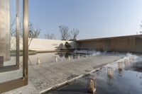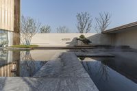 A stunning example of modern architecture in a residential area, with a focus on open space and natural elements such as trees and water resources.