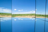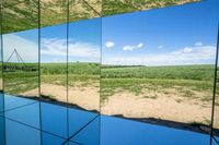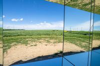 The lush landscape of Germany features a unique combination of modern architecture and natural elements, including grass, vegetation, and a windmill. The open property stretches out to the horizon, with an azure sky and white clouds mirrored in the nearby water resources. Rectangles of mesh and composite material, as well as wire fencing, create a unique biome of art and nature.