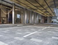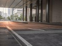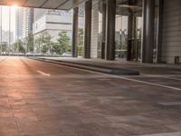 A view of a modern cityscape in Shenzhen, China at dawn. The infrastructure includes a low asphalt road, lined with wood plank flooring and curbs, illuminated by the morning sunlight. Automobiles can be seen driving along the road surface, and the metropolitan area is full of modern buildings, real estate, hotel lobbies, and many other features.