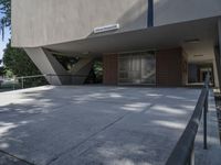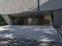 a man is walking up the steps outside of a building with a railing and concrete floor