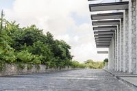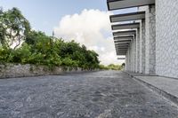 A view of a modern architecture building in Solidaridad, Mexico, surrounded by trees and vegetation.
