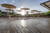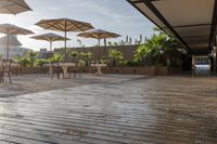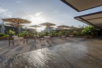 A stunning example of modern architecture in Solidaridad, Mexico. This residential building features a beautiful combination of wood flooring, roof, and floor-to-ceiling windows that offer breathtaking views of the clear sky and the surrounding tree-filled landscape. The spacious courtyard, shaded by umbrellas, provides the perfect spot for relaxation and leisure. With a swimming pool, hotel, restaurant, and cafe on-site, this resort-style property is the ideal vacation destination.