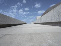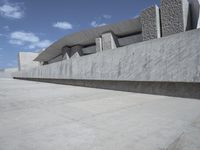 A beige building with a concrete facade and a limestone stair in Tenerife, Spain. The landscape has a modern and futuristic architecture with a symmetrical open space, a clear sky and a straight road. An elevated roof, paver and a high wall are also visible