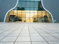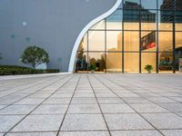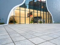 A straight-down view of a modern open plaza in Taichung, Taiwan, with a paver surface and theater in the background. This view is representative of the modern architecture found across the Republic of China and Asia.
