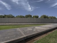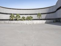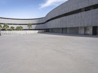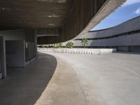 A view of the urban design of Tenerife, Spain featuring a mix of modern architecture, roads, vegetation, a bridge, and a business district in the background. Grass, concrete, asphalt, walls, a factory, a building, a museum, a memorial, a community center, a skatepark, and a nonbuilding structure are all visible.