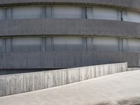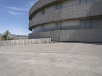 A composite material facade of a modern building is seen in the business district of Tenerife, Spain. The building features a mix of concrete, cement, wood, and rock surfaces, with a grassy open space in front. The clear sky above adds to the urban design of the city.