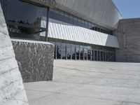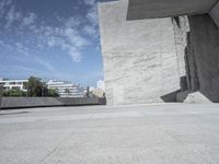 A futuristic cityscape showcasing low concrete buildings, white walls, and asphalt pavements. Tourists can explore the local Brutalist architecture featuring composite materials and composite material properties. The clear sky allows for a perfect day to explore the many modern architectures in Tenerife, Spain.