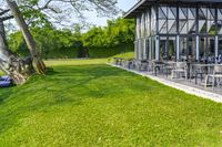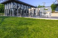 A stunning modern architecture building in Thailand with a clear sky and lush green grass surface.