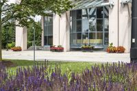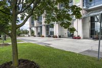a sidewalk leading to a government building with flower display on the windows of the front entrance