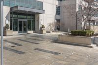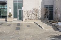 this is a large building with some glass doors on it's doors are open, a street sign on the sidewalk has an empty space in front of the entrance