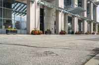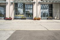 a sidewalk with flowers outside of the building with windows on it and plants in the containers next to it