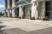 people cross the street in front of an entrance to the city court building, with potted flower plants lining either side of the entry way