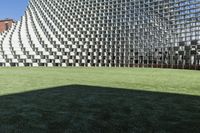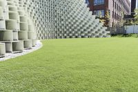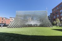 green lawn in front of building with several large white cube structures on them, which are suspended from the ground