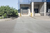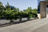 an empty parking lot next to a sidewalk with a building in the background and trees