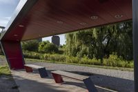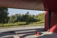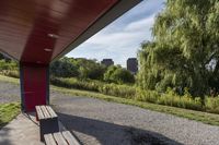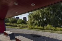 a wooden bench sits beneath a roof on a cement lot in the shade, next to some trees and grass