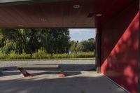 a park bench in front of a building that is painted red and has several mirrors on it