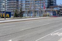 A view of modern architecture in Toronto, Ontario, Canada. The photo shows a high-rise condominium building with glass walls and a glass facade. The cityscape is visible in the background, with clear skies and a straight road leading into the urban neighborhood. The foreground features lush grass, trees, and vegetation. The image captures the essence of urban design and city life in Toronto.