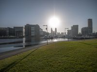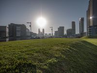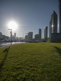 A stunning view of modern architecture in the urban cityscape, with lush green vegetation and clear blue skies.