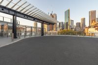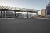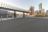 A stunning view of a modern architecture building in the heart of the city, surrounded by asphalt roads and a clear sky.