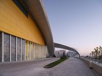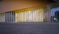 A cityscape of a modern architectural building with a sleek facade and clean lines, illuminated by the soft morning light. The urban design showcases the concrete structure and artificial light, creating a futuristic atmosphere in the business district.