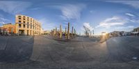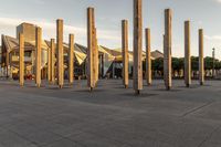 A stunning view of a modern architecture building in Wellington, New Zealand, at dawn. The low light casts a beautiful glow on the wooden columns and metal structure. The courtyard is surrounded by lush vegetation, providing a serene urban oasis. The clear sky above is marked by contrails, adding a touch of movement to the scene. This building serves as a hotel and museum, offering a unique blend of contemporary design and cultural exploration. The paved plaza in front of the building provides a perfect spot to enjoy the surrounding beauty.