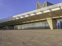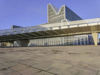 A high-rise office building with a concrete bridge and clear sky in the financial district of Zaragoza, Spain.