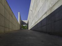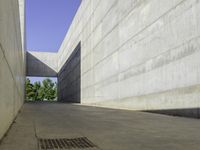 A view of the modern architecture in Zaragoza, Spain, showcasing a low concrete building with a straight road leading to a tunnel. The clear sky and hard shadows create an urban design masterpiece.