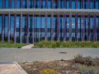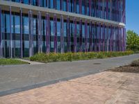 a building with pink glass and purple striped exterior is shown with the brick path on the left