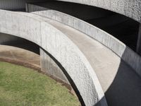 A multi-level composite material and concrete bridge is seen in the metropolitan area of Tenerife, Spain. The unique bridge features an industrial design with metal handrails and a beige and black monochromatic facade. The surrounding area features a mix of modern architecture, public spaces, and urban design.