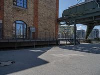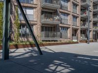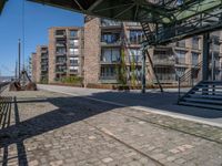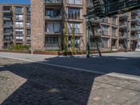 This stock photo captures the vibrant city life in Germany. The image showcases a modern residential area with well-designed architecture and clean roads. The clear sky above casts hard shadows, adding depth to the scene. The urban setting is characterized by sleek buildings and a well-maintained road surface. In the foreground, a brick wall stands, leading to a storage area or warehouse. The cobblestone path on one side adds an old-world charm to the overall composition. This photo perfectly represents the blend of modernity and history in a German city.
