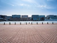 A scenic view of the city of Holland, Netherlands, from a pier in the harbor. The modern high-rise residential area is surrounded by a lake and a coastal line, with a clear sky and sunny day. The horizon is visible with its open space urban design, jetty, road surface, paver, vegetation, flag, and street light, all contributing to the cityscape.