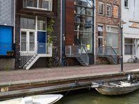 A street view of a modern residential area in Holland, Europe. The view shows a boat on the lake, a paver road, and a combination of classic and modern architecture. A cyclist is seen entering the highway ramp in the background, representing the hustle and bustle of city life.