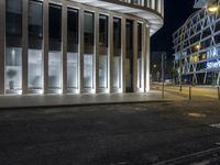A view of downtown Berlin, Germany, Europe, at night. The modern architecture of the cityscape is illuminated by the street lights, including buildings, houses, office blocks, vehicles, bicycles, and thoroughfares.