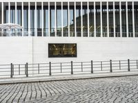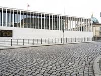 The sun rises over the Berlin skyline as cobblestone roads and modern architecture take shape in the foreground of the museum-filled city. Grey skies over Europe provide a muted backdrop to this urban landscape in Germany.