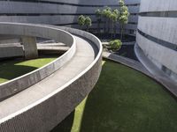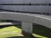 An elevated view of the city of Tenerife, Spain, featuring modern infrastructure, architecture, and urban design. A concrete bridge, highway entrance, road surface, and vegetation are visible, with various materials including metal, wood, concrete, and beige tiles visible in the monochrome landscape.