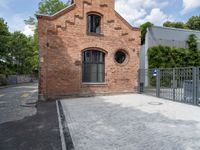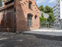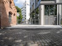 A straight-down view of a cobble-stoned street in Berlin, Germany, showcases a contrast between the modern office building and classic museum, with a metal wall and cloudy sky in the background.